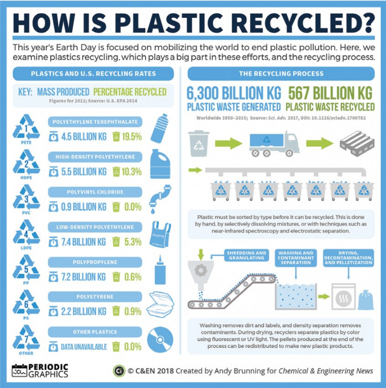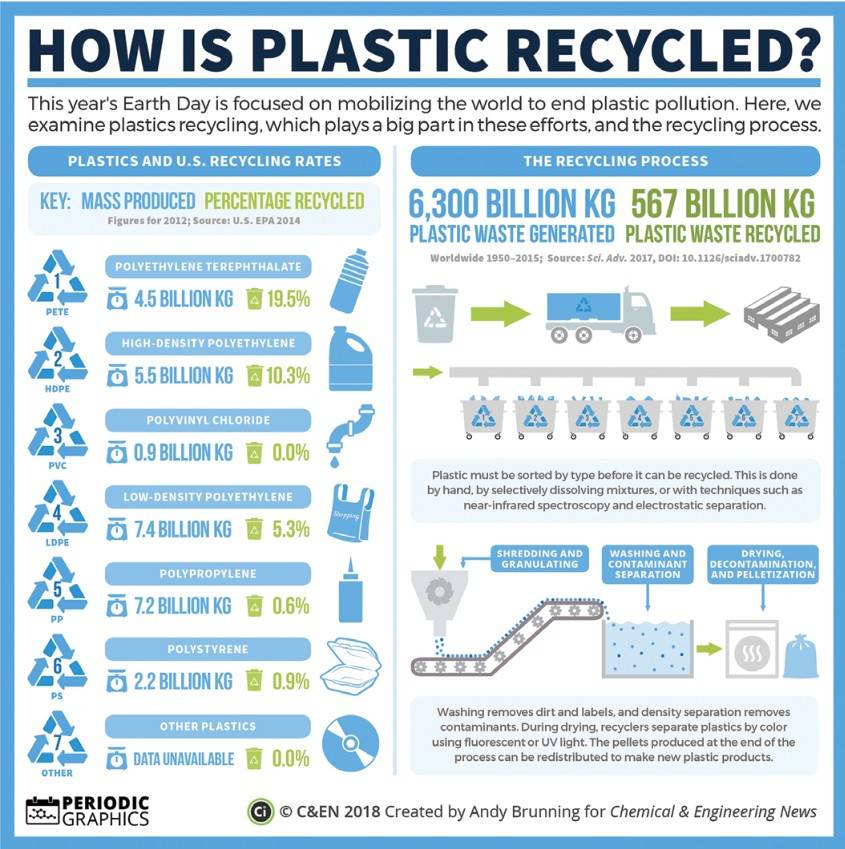 Une infographie en anglais sur le recyclage des plastiques, collaboration entre Chemical and Engineering News et Andy Brunning, auteur des infographies populaires du blog "compound interest".