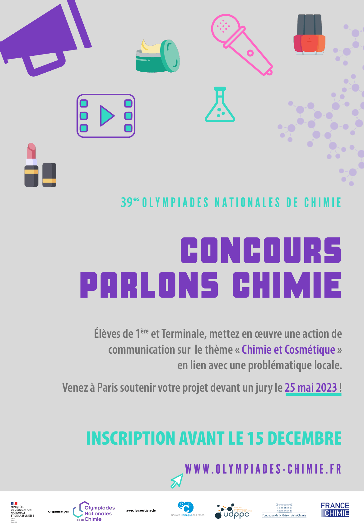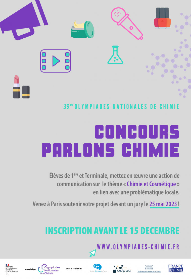 Exceptionnellement cette année, le thème du concours « Parlons Chimie » est imposé et se cale sur celui du concours scientifique. Les groupes devront donc se pencher sur le sujet « Chimie et Cosmétique », toujours en l’adaptant à une problématique locale.