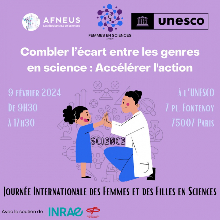 À l'occasion de la journée internationale des femmes et filles en science, les associations Femmes En Sciences et AFNEUS organisent avec l'UNESCO un évènement intitulé « Combler l’écart entre les genres en science : Accélérer l'action » . Le colloque aura lieu vendredi 09 février 2024 dans les locaux de l'UNESCO, à Paris.
