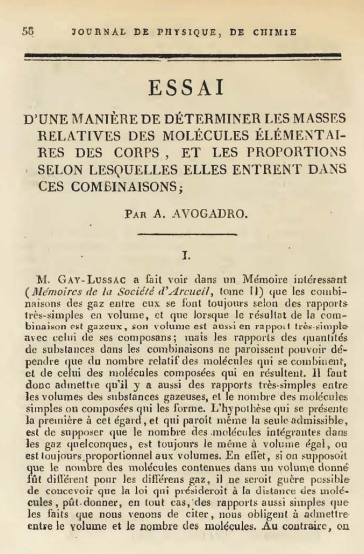 Afin de donner une explication théorique à la loi des volumes de Gay-Lussac, Avogadro énonce dans son essai publié en 1811 (voir figure 3) intitulé Essai d'une manière de déterminer les masses relatives des molécules élémentaires des corps et les proportions selon lesquelles elles entrent dans les combinaisons :
