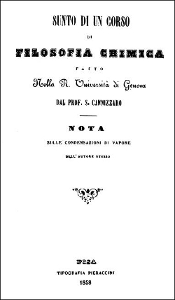 Ce n'est qu'une cinquantaine d'années plus tard que l'hypothèse d'Avogadro est ressuscitée. Dans son mémoire Sunto di un corso di Filosofia chimica publié en 1858, Stanislao Cannizzaro (1826-1910), qui a alors 33 ans, présente ses investigations sur le travail d’un demi-siècle de chimistes et physiciens à travers l’Europe (figure 4). Bien qu’il n’ajoute pas de nouvelles pièces au puzzle, Cannizzaro a la capacité intellectuelle de relier toutes les informations dont il dispose, éclairant des conceptions qui étaient auparavant obscures et confuses. Il y fait notamment le point sur les cinquante ans qui ont suivi la publication de l’hypothèse moléculaire d’Avogadro.