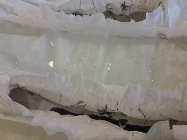 Le simulant est récupéré par un pressage doux à température ambiante dans un récipient en inox. Cette étape doit être réalisée avec précaution afin d’éviter que la couche n'éclate et libère le polyacrylate de sodium. Il est ensuite filtré sur papier filtre dans le but d’éliminer le polyacrylate de sodium (cristaux de gel absorbant) éventuellement libéré.