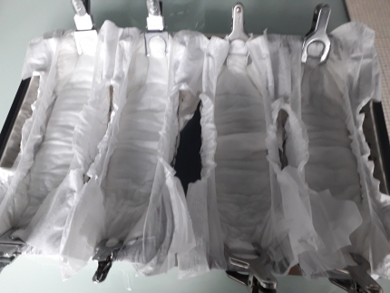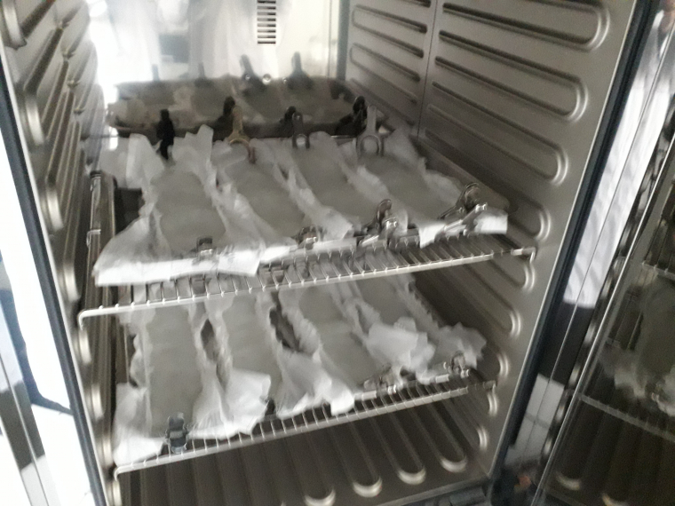 Les couches sont placées avec les bords relevés dans des plateaux en inox et maintenues à l’aide de pinces en inox.