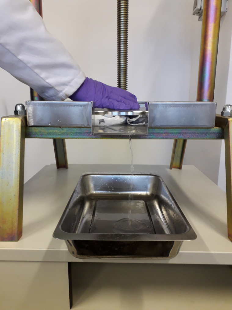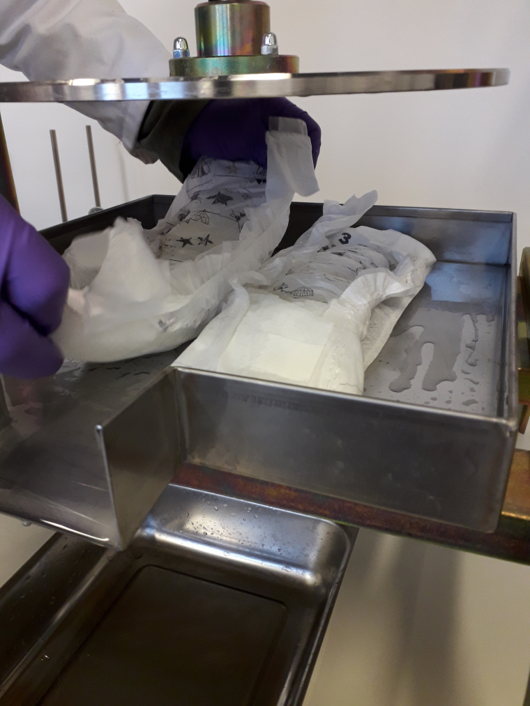 Pour l’étape de pressage, il est important de positionner le voile de la couche en contact avec le réceptacle où sera récupéré le simulant. La partie extérieure de la couche sera en contact avec la presse. Ce positionnement permet de limiter les risques de contamination pouvant venir de la face extérieure de la couche qui n’est pas en contact de la peau du bébé.