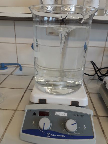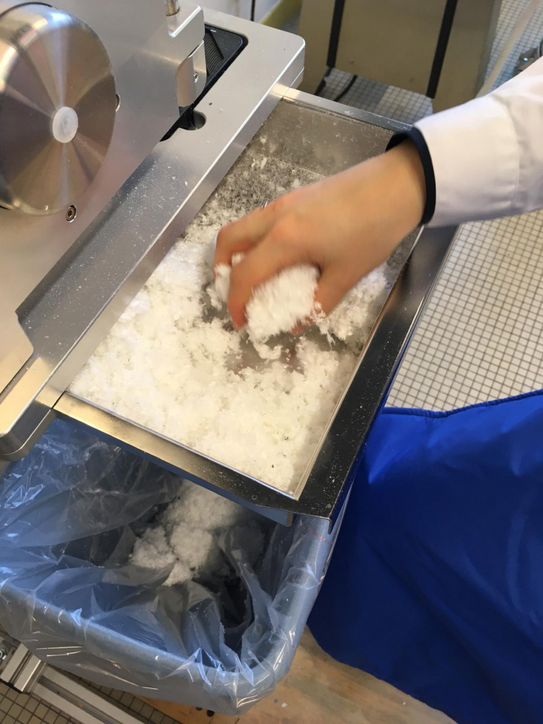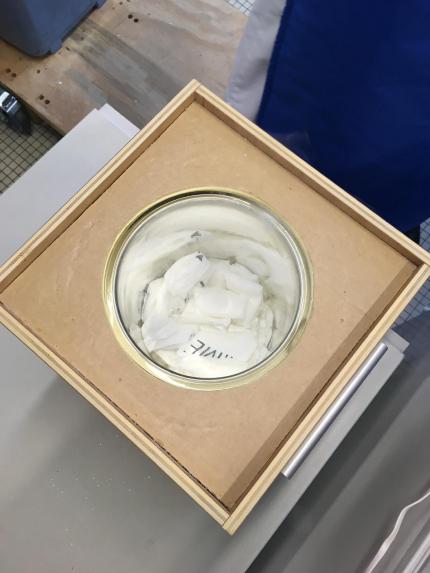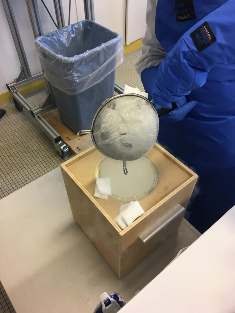 Les morceaux de couches sont trempés quelques secondes dans un Dewar contenant de l’azote liquide. Cette étape est nécessaire pour améliorer le processus de broyage afin de garantir une parfaite homogénéisation des échantillons, d'éviter une surchauffe, ainsi que l’agglomération de l’échantillon.