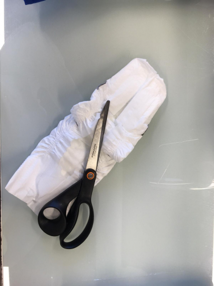 Dans un premier temps, les couches sont broyées dans leur intégralité (scratch, voile intermédiaire, partie imprimée…). Pour ce faire, elles sont découpées grossièrement en carré de 3 à 5 cm de côté avec une paire de ciseaux inox préalablement nettoyée avec de l’acétone. Ces morceaux de couches sont déposés dans un récipient recouvert de papier aluminium pour éviter tout risque de contamination, notamment à cause du plastique qui est susceptible de relarguer des phtalates et des HAP.