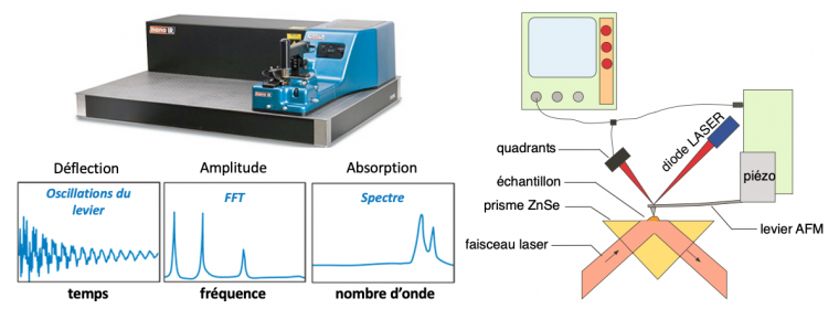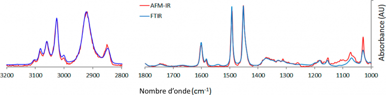 Il y a une quinzaine d'années, une nouvelle technique, appelée AFM-IR, a été développée et brevetée par Alexandre Dazzi, professeur à l’Institut de Chimie-Physique de l’université Paris-Saclay. Elle permet de coupler la résolution spatiale de la microscopie à force atomique (AFM) et la capacité d'analyse chimique de la spectroscopie infrarouge (IR). Cette technique permet de localiser des composés grâce à leur signature IR avec une résolution qui est celle de l'AFM, de l'ordre de la dizaine de nanomètres. Cette technique offre ainsi la possibilité de réaliser de l'imagerie chimique en traçant des cartes d'absorption dans l'IR à une longueur d'onde donnée. Elle permet aussi d'enregistrer des spectres infrarouge locaux en des points fixes. Sur la figure 1, des spectres de polystyrène obtenus par AFM-IR sont comparés à des spectres obtenus classiquement en spectroscopie IR à transformée de Fourier (FT-IR).