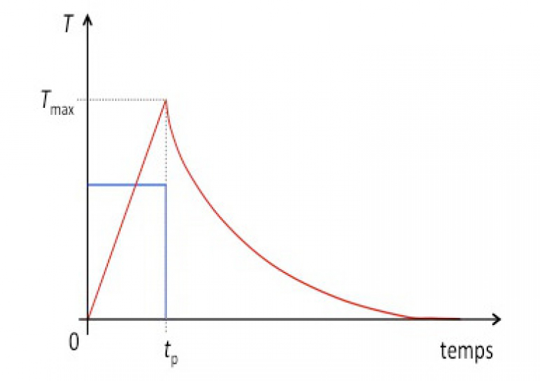 L'augmentation de température est linéaire durant l'impulsion puis décroît de manière exponentielle.