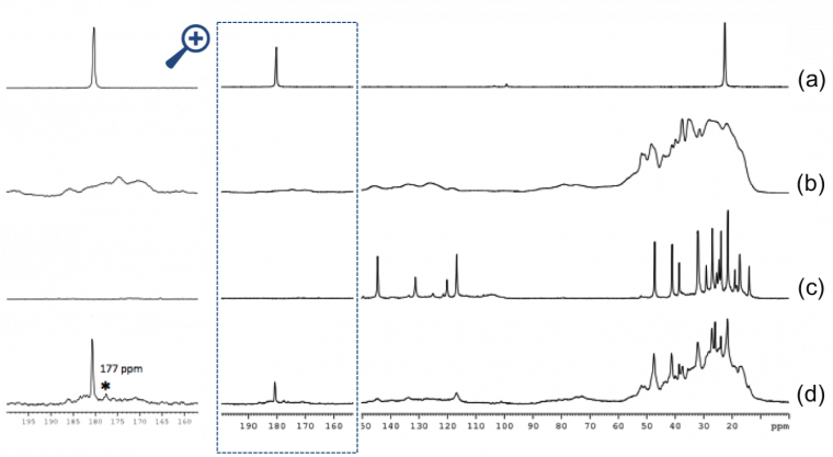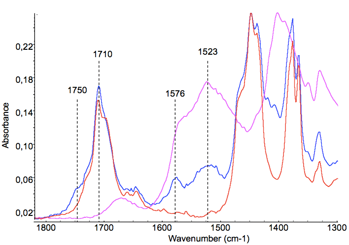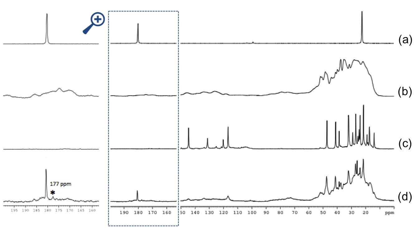 En effet, en comparant les signaux des ingrédients seuls (acétate de plomb, vernis mastic) et les signaux du gel obtenu en les mélangeant, on constate notamment l’apparition d’un épaulement à 1750 cm-1 en IR (Figure 13) et d’un pic à 177 pm en RMN 13C-MAS (Figure 14). Dans les deux cas, le signal se trouve dans la zone de détection des carbonyles (C=O). Cela témoigne de la formation de nouveaux environnements chimiques acides dans le gel après mélange des composés initiaux, que l’on peut attribuer à l’interaction entre le plomb et les triterpénoïdes.
