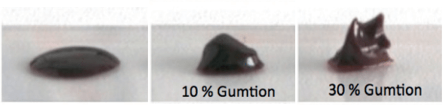 Dans un premier temps, des expériences de rhéologie ont été menées afin de mieux appréhender les propriétés physiques du gumtion. Les mesures de viscosité du gumtion, de la peinture seule et d’un mélange gumtion/peinture ont permis de mettre en évidence l’effet assez spectaculaire de l’ajout de ce médium dans la peinture [9], comme on peut le voir sur la Figure 11. Cela a sûrement impressionné les artistes qui expérimentaient dans leurs ateliers et renforcé leur intérêt pour ces médiums.