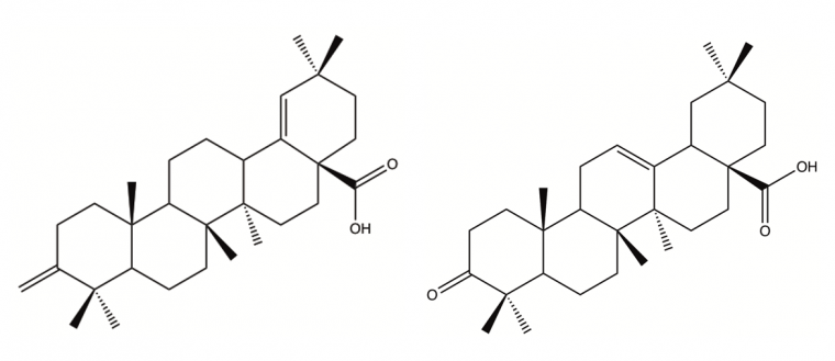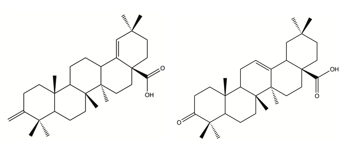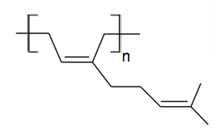 - une résine mastic naturelle provenant de l’île de Chios en Grèce. Elle contient en majorité des triterpénoïdes (grosses molécules dont le squelette est formé d'une trentaines d'atomes de carbone arrangés en cycle) et un polymère, le 1,4-poly-β-myrcène (Figures 7, 8 et 9) ;