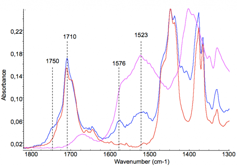 Par ailleurs, des techniques comme la spectroscopie infra-rouge (IR) ou la Résonance Magnétique Nucléaire du carbone à l’état solide (RMN 13C-MAS, pour Magic Angle Spinning car elle nécessite la rotation de l’échantillon) fournissent des informations cruciales quant aux interactions des constituants à l’échelle moléculaire.