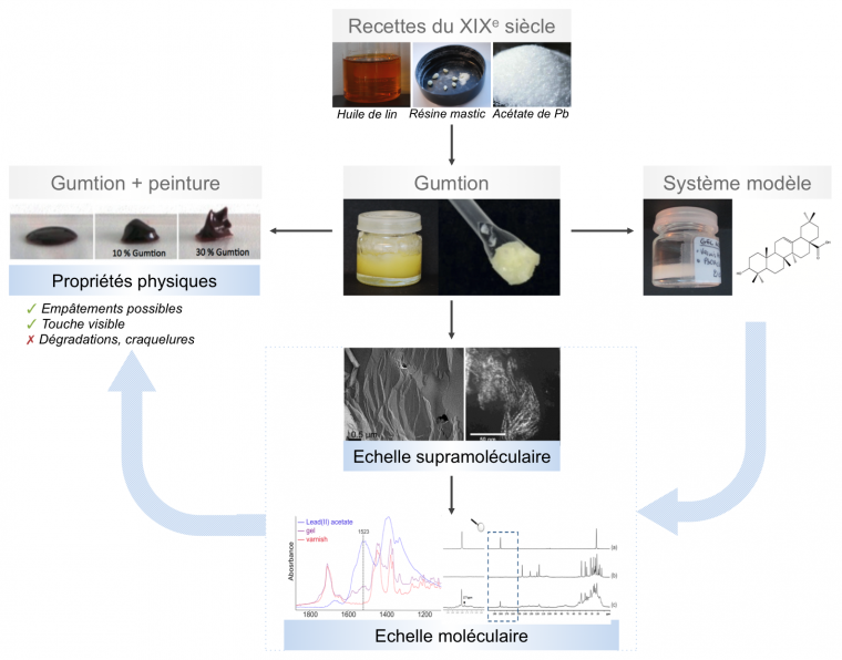 Toutes ces méthodes d'analyse permettent d'étudier le matériau à différentes échelles : les chercheurs s'intéressent d'abord à ses propriétés physiques et tentent ensuite de comprendre le gumtion à l’échelle moléculaire.