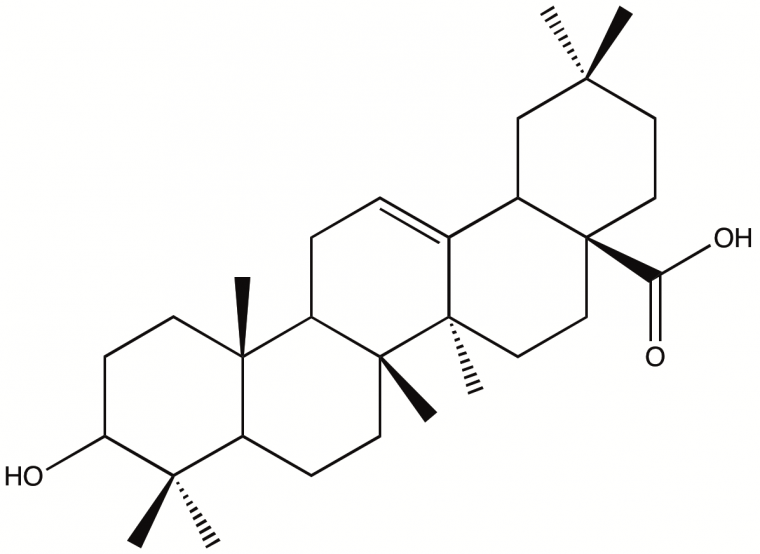 La caractérisation de la résine mastic par Chromatographie en Phase Gazeuse couplée à la Spectrométrie de Masse (GC/MS) a permis l'identification d'au moins une vingtaine de triterpénoïdes différents. Il a ainsi été possible d’acheter une molécule dont la structure est très proche des composés identifiés dans la résine mastic, l’acide oléanolique (Figures 7 et 8). Il est donc employé pour la confection de systèmes modèles très simplifiés contenant trois constituants : l’acide oléanolique, l’essence de térébenthine et l'acétate de plomb.