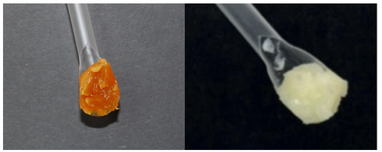 - Dans le cas du megilp, il faut préalablement cuire l’huile en présence de litharge (α-PbO), un oxyde de plomb de couleur orange, jusqu’à obtenir un liquide visqueux brun foncé : « l’huile noire ». C’est en mélangeant cette huile à la résine mastic que l’on obtient un gel orange foncé, généralement utilisé avec les peintures sombres [6] (Figure 6 gauche).