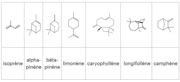 - de l’essence de térébenthine qui, une fois mélangée à la résine mastic forme le vernis mastic. Elle contient de nombreux composés, essentiellement des terpènes, molécules dont les formules brutes sont du type (C5H8)n. Leurs squelettes carbonés sont constitués d'unités isopréniques (c'est-à-dire dérivées de l'isoprène) reliées les unes autres (Figure 10).