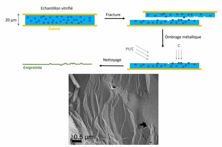 Afin d’avoir une meilleure appréciation de la morphologie du gel, des images ont été obtenues par microscopie électronique après cryo-fracture. Cette technique d’imagerie généralement utilisée pour l’observation de matériaux mous (comme les tissus biologiques) est bien indiquée pour l’étude des gumtions. Ce procédé nécessite la préparation de l’échantillon (Figure 12) et présente une étape de vitrification du matériau analysé en le congelant à très basse température (-196 °C). Il est ensuite brisé et la fracture va suivre des lignes privilégiées selon les structures qu’elle rencontre. C’est finalement l’empreinte de la fracture qui est observé en microscopie électronique (l’utilisation d’un faisceau d’électrons permet une très bonne résolution et la mise en évidence de structures fines).
