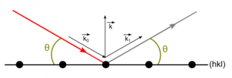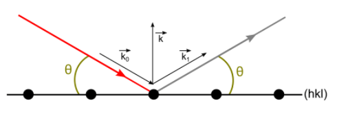 Ainsi, pour que la diffraction ait lieu, le vecteur de diffusion $\vec{k}=\vec{k_1}-\vec{k_0}$ doit être un vecteur du réseau réciproque à coordonnées entières : c'est la condition de Laue. Notons que c’est un vecteur normal (perpendiculaire) aux plans d’indices de Miller (h k l) !