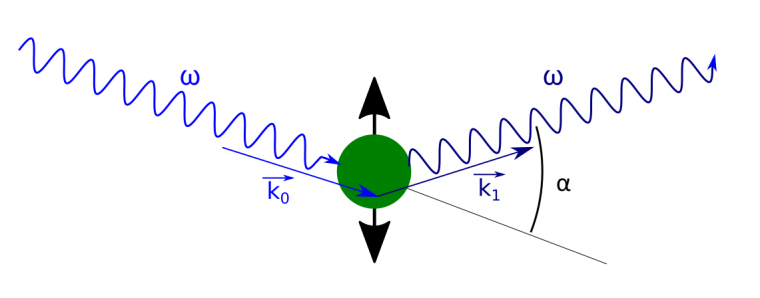 Sous l’effet d’une onde électromagnétique, de vecteur d’onde $\vec{k_0}$, par exemple un rayon X, un électron se met à osciller. En tant que particule chargée accélérée, il rayonne une nouvelle onde électromagnétique de même longueur d’onde (donc de même énergie), de vecteur d’onde
