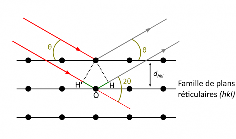 La loi de Bragg relie la distance entre les plans réticulaires d’une même famille à la direction dans laquelle le faisceau diffracté est observé et sa longueur d’onde :