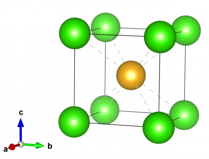 Les anions Cl–, en vert, occupent les sommets du cube et le cation Cs+, en jaune, occupe le centre du cube).