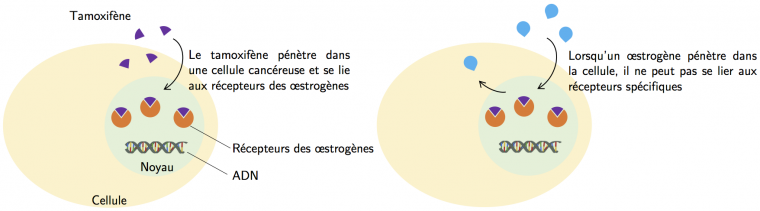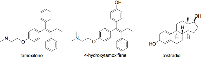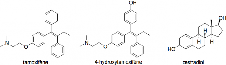 Le tamoxifène (Z-2-[4-(1,2-diphényl-1-butényl)phénoxy]-N,N-diméthyléthanamine), découvert à la fin des années 1950 par Arthur Walpole, est la molécule la plus souvent prescrite à des patientes diagnostiquées d'un cancer du sein hormono-dépendant. Dans ce type de cancer, le récepteur des œstrogènes est impliqué dans la prolifération des cellules cancéreuses. L'action antiproliférative de la forme hydroxylée du tamoxifène, l'hydroxytamoxifène, est due à une liaison compétitive au récepteur des œstrogènes, qui réprime la transcription de l'ADN provoquée par l'œstradiol (figure 2).