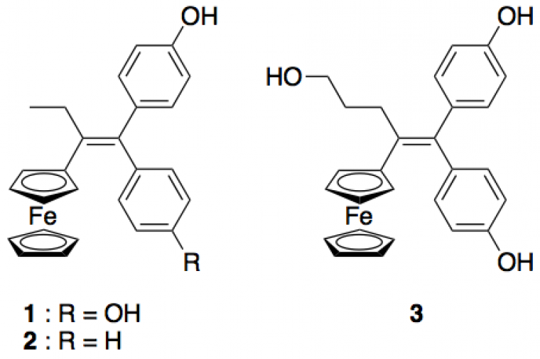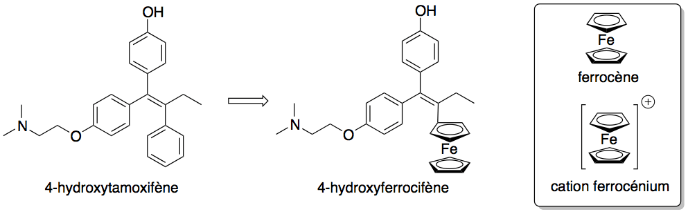Pour lutter contre les deux formes de cancer du sein, des molécules possédant les deux fonctions (anti-œstrogénécité et cytotoxicité indépendante des œstrogènes) ont été développées. La cytotoxicité d’une molécule désigne sa capacité à être toxique pour des cellules. Ainsi, lorsqu'un groupement phényle d'un composé de type tamoxifène est remplacé par un ferrocène (Figure 4), l'hydroxyferrocifène alors obtenu possède une cytotoxicité supérieure à l'hydroxytamoxifène correspondant, en raison de la cytotoxicité du cation ferrocénium Fc+.