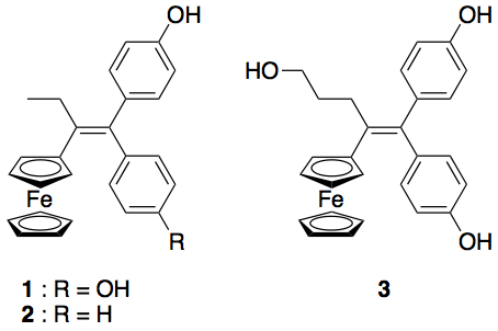 Dans la famille des ferrocifènes, le complexe diphénol 1 (Figure 5) a été décrit comme l'une des molécules les plus efficaces ayant un effet antiprolifératif, à la fois in vitro sur différentes lignées cellulaires (IC50 = 0,65 µmol·L–1 dans des cellules cancéreuses du sein de la lignée MDA-MB-2311) et in vivo sur l'inhibition de la croissance de tumeurs cérébrales.