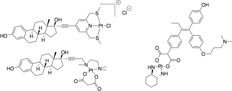 La découverte des propriétés anticancéreuses du cis-platine (cis-[PtCl2(NH3)2]) dans les années 1960 a révolutionné le traitement du cancer des testicules et a mené à un renforcement de la recherche de complexes organométalliques servant d'agents antitumoraux, c’est-à-dire luttant contre une tumeur. En revanche, le cis-platine n'est jamais prescrit pour le traitement du cancer du sein en raison de sa faible efficacité sur les cellules de cancer du sein. Ainsi, des complexes dérivés du cis-platine et possédant une bonne affinité pour le récepteur aux œstrogènes ont été synthétisés (Figure 3).