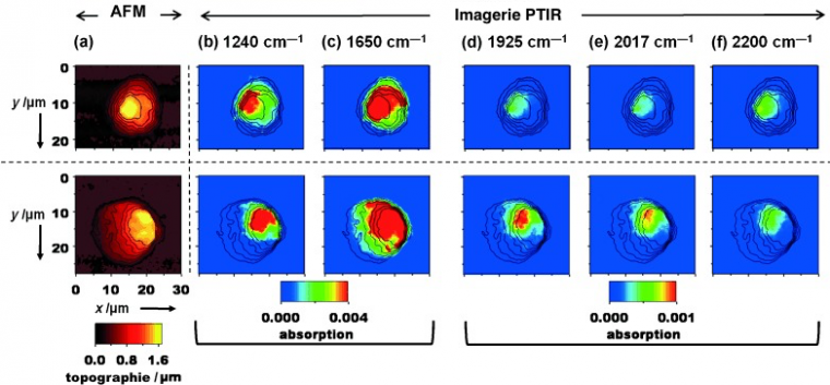 Pour voir la distribution du composé 4 par AFM-IR, les cellules incubées et les cellules témoins ont été déposées sur un prisme de ZnSe. Elles ont d'abord été identifiées par la topographie (Figure 8(a)) puis des cartes ont été enregistrées à différents nombres d'onde (Figure 8(b-f)) : 1240 cm–1 (phosphate), 1650 cm–1 (amide I), 1925 et 2017 cm–1 (tricarbonyle) et 2200 cm–1 (témoin négatif).
