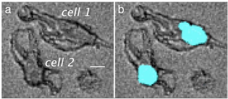 Cette expérience permet de comparer la localisation dans les cellules de la molécule 4 et celle du DAPI, que l’on sait nucléaire. On constate ici que ces deux molécules sont localisées au même endroit dans la cellule, ce qui permet de confirmer l'accumulation du composé 4 dans le noyau des cellules (Figure 11) 1.
