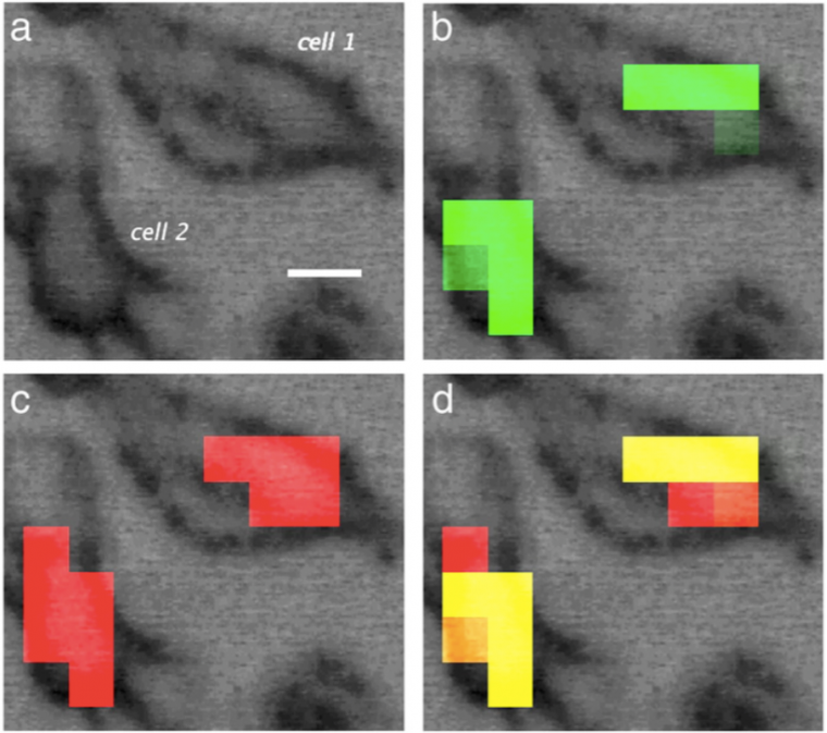 Cartes SR-FTIR-SM : (b) Bande E des fonctions carbonyle (vert), (c) Bande des fonctions amide-I (rouge), (d) Superposition des deux signaux.
