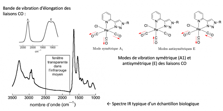 Afin de détecter des molécules d'intérêt dans des cellules, de nombreux marqueurs greffables ont été développés ; la plupart d'entre eux sont des marqueurs fluorescents. Cependant, les ferrocènes sont connus pour éteindre la luminescence, ce qui peut empêcher l'application de cette méthode dans ce cas. D'autres techniques spectroscopiques d'imagerie n'impliquant pas la désexcitation d’états excités peuvent être envisagées. C'est le cas de la spectroscopie infrarouge qui se révèle être une méthode de choix. L'équipe de Clotilde Policar, à l’École normale supérieure, a développé l'utilisation de la spectroscopie IR et des sondes IR utilisables dans ce contexte. Elle a montré que l'utilisation de groupements de type métal-tricarbonyle (possédant trois groupements carbonyle CO) permet de marquer et de localiser des composés d'intérêt en milieu cellulaire, en raison des bandes de vibrations d'élongation symétrique (bande A1) et antisymétrique (bande E dédoublée) situées dans la fenêtre transparente des cellules (entre 1800 et 2100 cm–1) (Figure 6).
