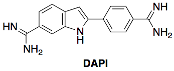 Enfin, les noyaux ont été marqués par une solution de DAPI (4,6-diamidino-2-phénylindole, Figure 10), molécule fluorescente connue pour marquer spécifiquement les noyaux des cellules par liaison aux base adénine et thymine de l’ADN, et observés par microscopie de fluorescence (excitation à 350 ± 50 nm, émission à 460 ± 50 nm).