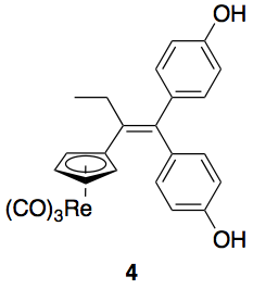 Cette méthode a été initialement appliquée au 1,1-di(4-hydroxyphényl)-2-cyrhetrenylbut-1-ène, un composé organométallique dans lequel une unité [(Cp)Re(CO)3] (Cp désignant le cyclopentadiène) est liée à une structure de type hydroxytamoxifène (composé 4, Figure 7).