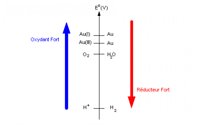 E°(H+/H2) = 0,0 V ; E°(O2/H2O) = 1,23 V ; E°(Au3+/Au) = 1,50 V ; E°(Au+/Au) = 1,68 V.