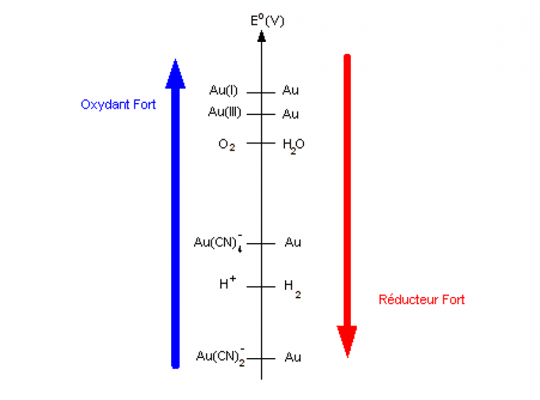 Si l'on place une feuille d'or à la surface d'une solution aqueuse d'ions cyanure (préparée à partir de cyanure de potassium KCN), on observe la disparition de cette feuille d'or au bout de quelques minutes1. L'oxydation de l'or par l'eau est ainsi effective, rendu possible par la diminution du potentiel standard des couples Au(I)/Au et Au(III)/Au par complexation des ions aureux - Au(I) - et aurique - Au(III) - par le cyanure (figure 2). On assiste alors à un renforcement du pouvoir du réducteur conjugué - Au -, perdant ses propriétés de métal noble.