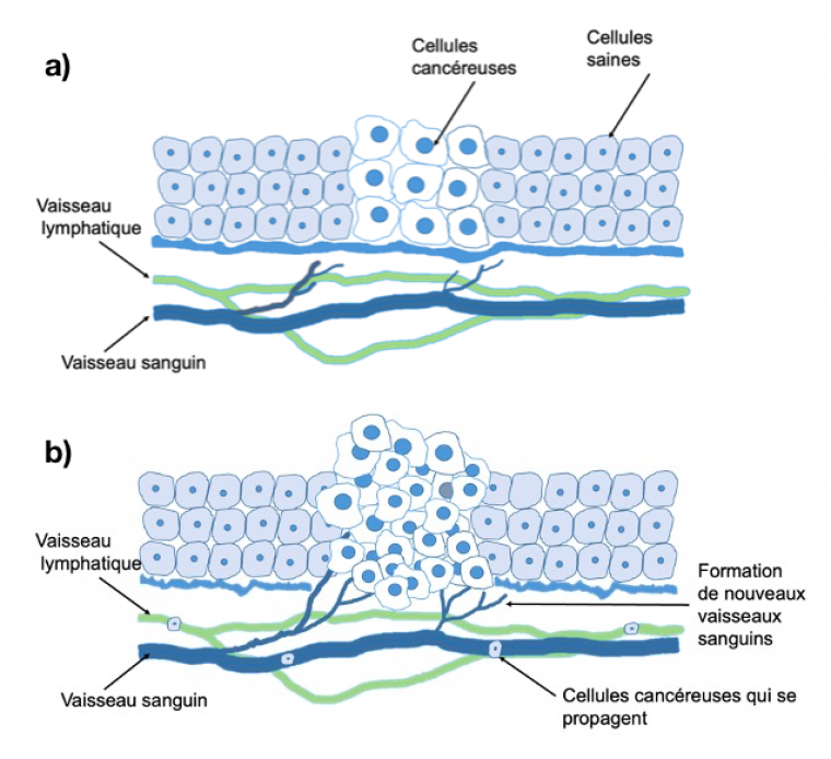 Un autre avantage de l’utilisation de nanoparticules pour le traitement du cancer est lié à l’angiogenèse tumorale 9 (Figures 1a et 1b). En effet, ce phénomène de formation de néovaisseaux non étanches autour de la tumeur facilite l’accès des nanoparticules à la tumeur ; par ailleurs, l’inefficacité du drainage lymphatique dans les tissus cancéreux « coince » la nanoparticule au sein de la tumeur. Ceci a posé les bases de l'effet EPR (Enhanced Permeability and Retention, en anglais), il y a environ 35 ans.