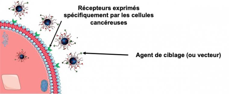 Pour limiter cette phagocytose, la fonctionnalisation des surfaces des nanoparticules par des polymères dit antiadhésifs a été développée. C’est ainsi que la seconde génération de nanoparticules utilisées dans le traitement du cancer a vu le jour. Cette nouvelle génération tire parti des propriétés d’encapsulation de la première génération, auxquelles sont greffées des chaînes de polymères hydrophiles neutres (très souvent le polyéthylène glycol, PEG). Ainsi les nano-cages deviennent « furtives », ce qui limite leur élimination par le système immunitaire et leur accumulation hépatosplénique. Pour améliorer l’efficacité thérapeutique, il est possible de jouer sur le fait que les cellules cancéreuses sur-expriment des récepteurs contrairement aux cellules saines (Figure 3). L’idée est donc de greffer un ligand associé au récepteur des cellules cancéreuses afin de concentrer préférentiellement les nanoparticules autour des cellules cancéreuses et de protéger les cellules saines.