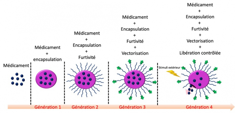 On parle alors de « nano-vecteur ». Ainsi est née la troisième génération, où le concept de ciblage actif a été utilisé. Enfin, la quatrième et dernière génération a conduit au développement de nanomatériaux dit « intelligents ». Pour l’élaboration de ces nano-objets, l’ensemble des caractéristiques de chacune des générations précédemment présentées a été repris ; on y ajoute une réponse à un stimulus extérieur lors de la libération du médicament. Les stimuli étudiés peuvent être le pH, la lumière, la température, le champ magnétique, etc. Ainsi cela permet à la nano-cage de ne libérer le médicament qu’une fois le site cancéreux atteint, via l’utilisation d’un stimulus auquel le système est sensible. Cette ingénierie a pour avantage considérable de « garder » le médicament jusqu’à ce que le nano-vecteur ait atteint sa cible et de le libérer sur demande. Ainsi, les doses de médicament injectées au patient peuvent être réduites au minimum.