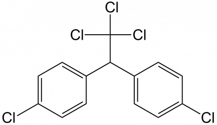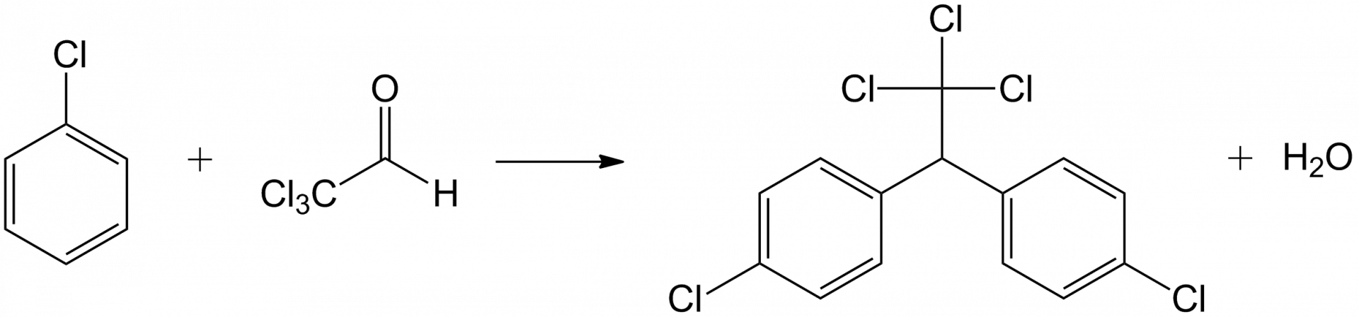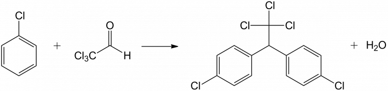 Les premières synthèses du dichlorodiphényltrichloroéthane (DDT) datent du XIXe siècle mais ce n’est qu’au cours des années 1930 que ses propriétés insecticides sont mises en évidence. Il est synthétisé à grande échelle à partir de la Seconde Guerre Mondiale (notamment pour approvisionner les Alliés), à partir de chlorobenzène et de trichloroacétaldéhyde (chloral), en présence d’acide sulfurique et à chaud, via une double substitution électrophile aromatique :