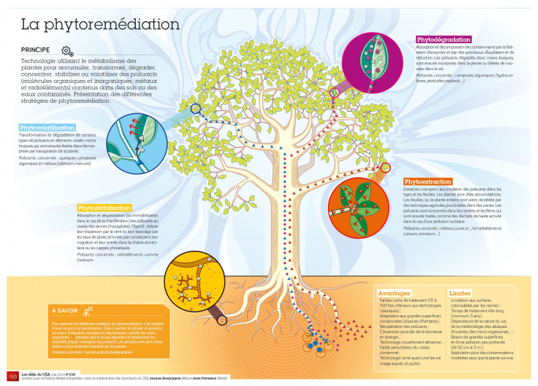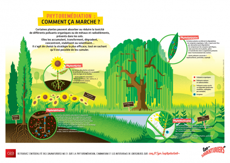 Le magazine « Les Savanturiers », publié par le CEA, propose une infographie et une animation expliquant la phytoremédiation adaptées au jeune public.