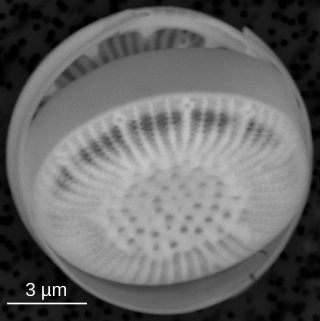 Le frustule est composé de silice amorphe et montre une architecture très détaillée à l’échelle submicrométrique avec des pores de différentes tailles et morphologies, ordonnés très régulièrement. Image en microscopie électronique à balayage.
