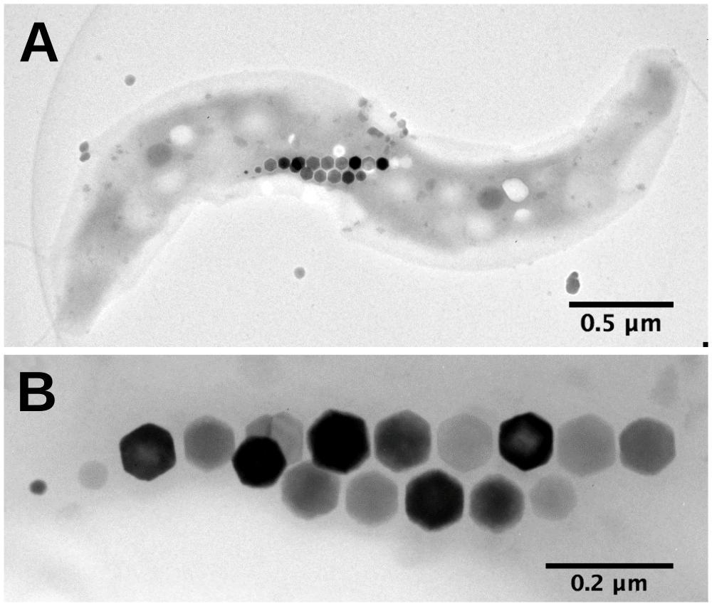 Images en microscopie électronique en transmission d’une bactérie magnétotactique. La bactérie est un spirille. Une chaine de plusieurs cristaux de magnétites alignés apparait en sombre. L’agrandissement montre que ces cristaux de magnétites sous cette projection apparaissent comme hexagonaux. Crédit : Nicolas Menguy (IMPMC, Sorbonne université).