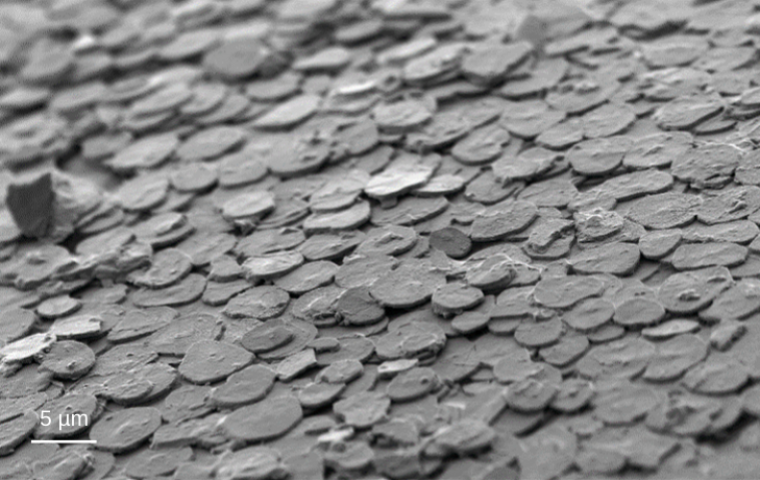 B : Coupe transversale du test observée en microscopie électronique à balayage. Les cristaux de calcite apparaissent clairs. Ils sont agencés très régulièrement à l’échelle micrométrique au sein de la structure qui est parsemée de trous (en foncé). Crédit : Heike Runge (Max Planck Institute of Colloids and Interfaces)