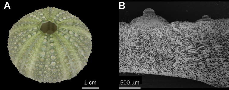 A : Le test de l'oursin Paracentrotus lividus est composé de plusieurs plaques assemblées comme un puzzle. Chaque plaque diffracte comme un mono-cristal de calcite. Crédits : Guillaume Laurent et Marie Albéric (LCMCP, Sorbonne Université).