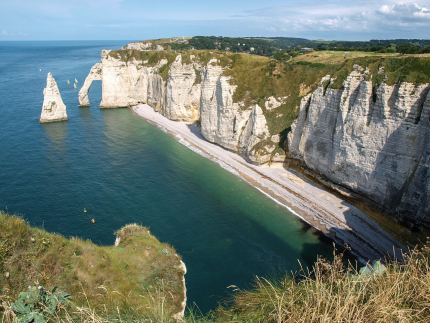 La formation de ces falaises de craie résulte principalement de l’accumulation de coccolithes, cristaux de calcite formés par des algues unicellulaires, les coccolithophoridés. Une échelle est suggérée par les bateaux.