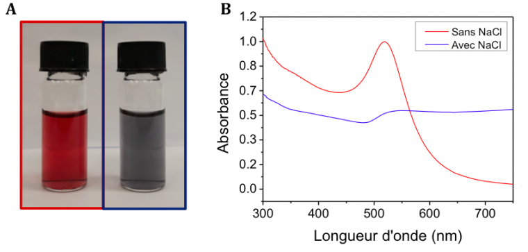Les nanoparticules se repoussent entre elles et ne s’agrègent pas grâce à la répulsion électrostatique. Si on ajoute à cette suspension du chlorure de sodium (NaCl), alors les ions sodium chargés positivement vont venir écranter les charges de surface des nanoparticules. Les nanoparticules s’agrégent alors et un changement de couleur est observable : la solution passe de rouge à bleue. Cette agrégation, irréversible, pose un problème si l’on souhaite utiliser ces particules dans le domaine de la médecine car le sang contient une concentration saline relativement élevée. Pour pallier ce problème, il est possible de faire des échanges de ligands à la surface des particules d’or. On peut, par exemple, ajouter des ligands avec fonctions thiols comme le PEG-SH (polyéthylène glycol avec un thiol terminal) ou un alkyl-thiol. Les thiols ont une très forte affinité avec l’or et déplacent les ions citrate. Cette fois-ci, les nanoparticules d’or sont stabilisées grâce à une répulsion stérique et non plus électrostatique. L’ajout de sel ne modifiera pas la stabilité colloïdale.
