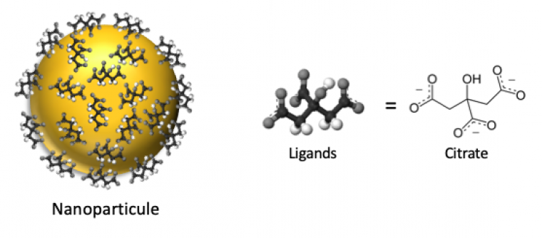 Les nanoparticules d’or sphériques présentées précédemment sont stabilisées en surface par l'ion citrate (Figure 1), qui est chargé négativement.