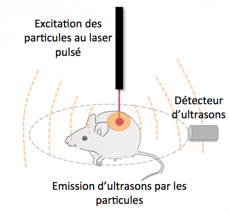 Les nanoparticules d’or peuvent aussi permettre de repérer les cellules cancéreuses par imagerie photoacoustique. L’imagerie photoacoustique, en tant que modalité de l’imagerie biomédicale, est basée sur l’effet photoacoustique [9]. Dans l’imagerie photoacoustique, des impulsions laser non-ionisantes sont envoyées dans les tissus biologiques dans lesquels des particules d’or sont préalablement injectées. Ces particules ont la capacité d’absorber une partie de cette lumière et de créer un fort dégagement de chaleur. Par conséquent, une partie de l’énergie émise par le laser est alors convertie en chaleur. Cette augmentation locale de la chaleur crée une dilatation des tissus. Ces derniers subiront des cycles de dilatation-compression générant des ondes mécaniques qui peuvent alors être détectées et analysées pour construire une image interne du patient. L’amplitude de l’émission d’ultrasons est proportionnelle à l’absorption optique. Les tissus biologiques n’ayant pas la même absorption optique, il est possible de réaliser des images 2D ou 3D de la zone ciblée. Les particules d’or, et plus particulièrement les nanobâtonnets d’or, ont une très forte absorbance plasmonique, c’est pourquoi ils sont d’excellents candidats comme agents de contraste en imagerie photoacoustique. En effet, les nanobâtonnets d’or sont capables de convertir plus de 90% des photons absorbés en chaleur grâce à des processus de désexcitation non radiatifs. Il est alors possible de repérer par imagerie photoacoustique l’emplacement des nanobâtonnets d’or in vivo.